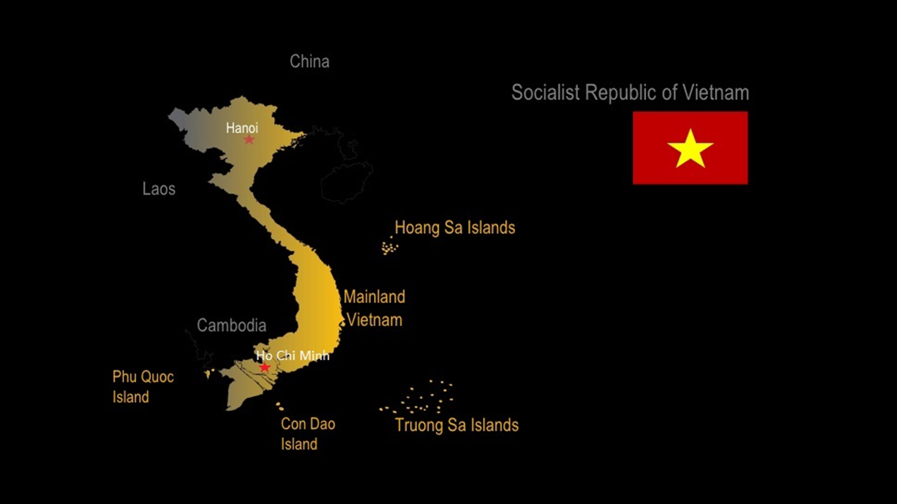 Extending along the Indochinese peninsula, Vietnam lies within the tropics, 11 degrees north of the equator. Bordering Chiba, Laos and Cambodia, it is approximately 128000sq miles (331000 sq km) in area, with a coastline stretching for 2040 miles (3260 km) from South China to the Gulf of Tonkin. With a diverse population of about 94 million people, Vietnam is divided into 58 tinh or provinces and 5 thu do or municipalities. Although Hanoi is the capital, Ho Chi Minh dominates the national economy.